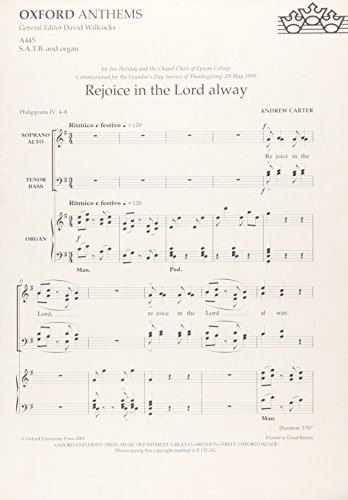 Andrew Carter gives new life to Rejoice in the Lord alway. A little bending of the rules ('Re' placed on the first beat of the bar/catchy little quaver rest in the middle 'Lord') in the opening figure soon proves attractive and acceptable in itself, not least by sheer force of repetition. There are some parallels with Purcell in treatment and texture - his spirit is never far away - and in the enjoyment to be derived from singing it. Organists' Review May 2002 In a completely different mood is Rejoice in the Lord alway, published as part of the Oxford Anthems series. This is an exciting work, full of variety and drama. It contrasts rhythmical writing with exciting use of syncopation and more sustained, legato sections, also utilising a variety of vocal textures throughout. In the right directors' hands and with a reasonably accomplished choir this work will potentially prove most dynamic. Music Teacher March 2002 There are some lovely moments; the ethereal 'And the peace of God' is not so easy, but your choir will enjoy the broad melody at 'and whatsoever things are true'. Church Music Quarterly December 2001